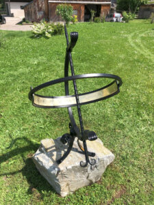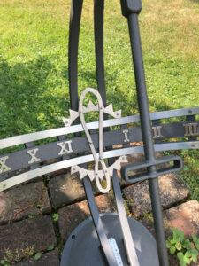 Handschmiedearbeit, Zeiger gespalten, handgetriebenes Messingstundenband, feuerverzinkt, lackiert